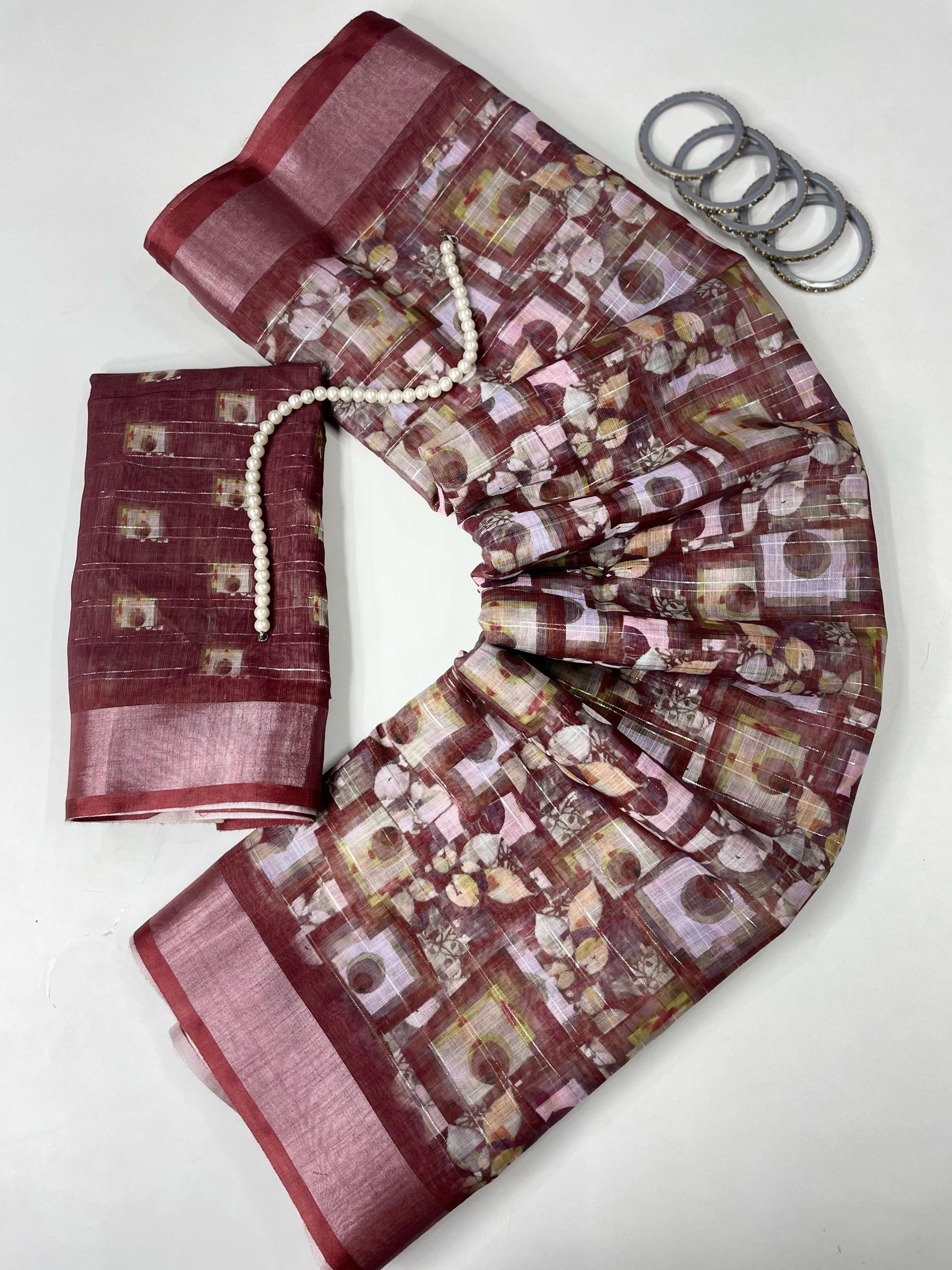 This elegant digital print saree in a refined Big Stone base and fresh Rubber Flower accents offers a sophisticated and trendy look. Crafted in breathable cotton linen, it's the perfect blend of tradition and modernity.